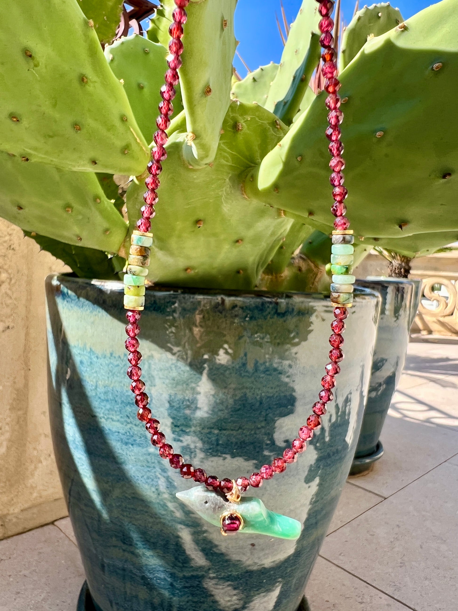 Ce collier Totem est en Grenat rouge de 3mm de diamètre et Heishi en agate verte.