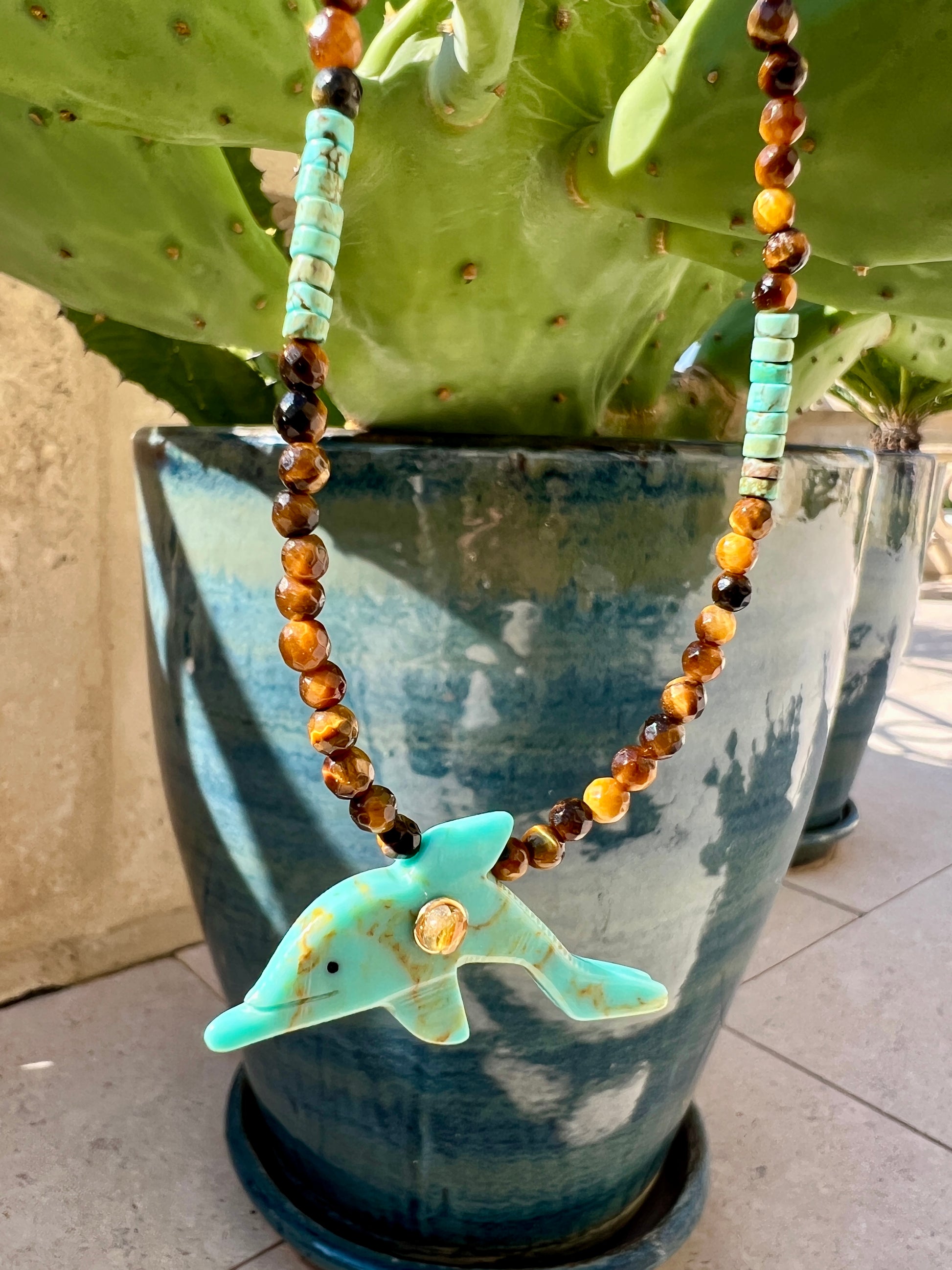 Ce collier Totem est en oeil de tigre naturel de 4mm de diamètre et Heishi turquoise.